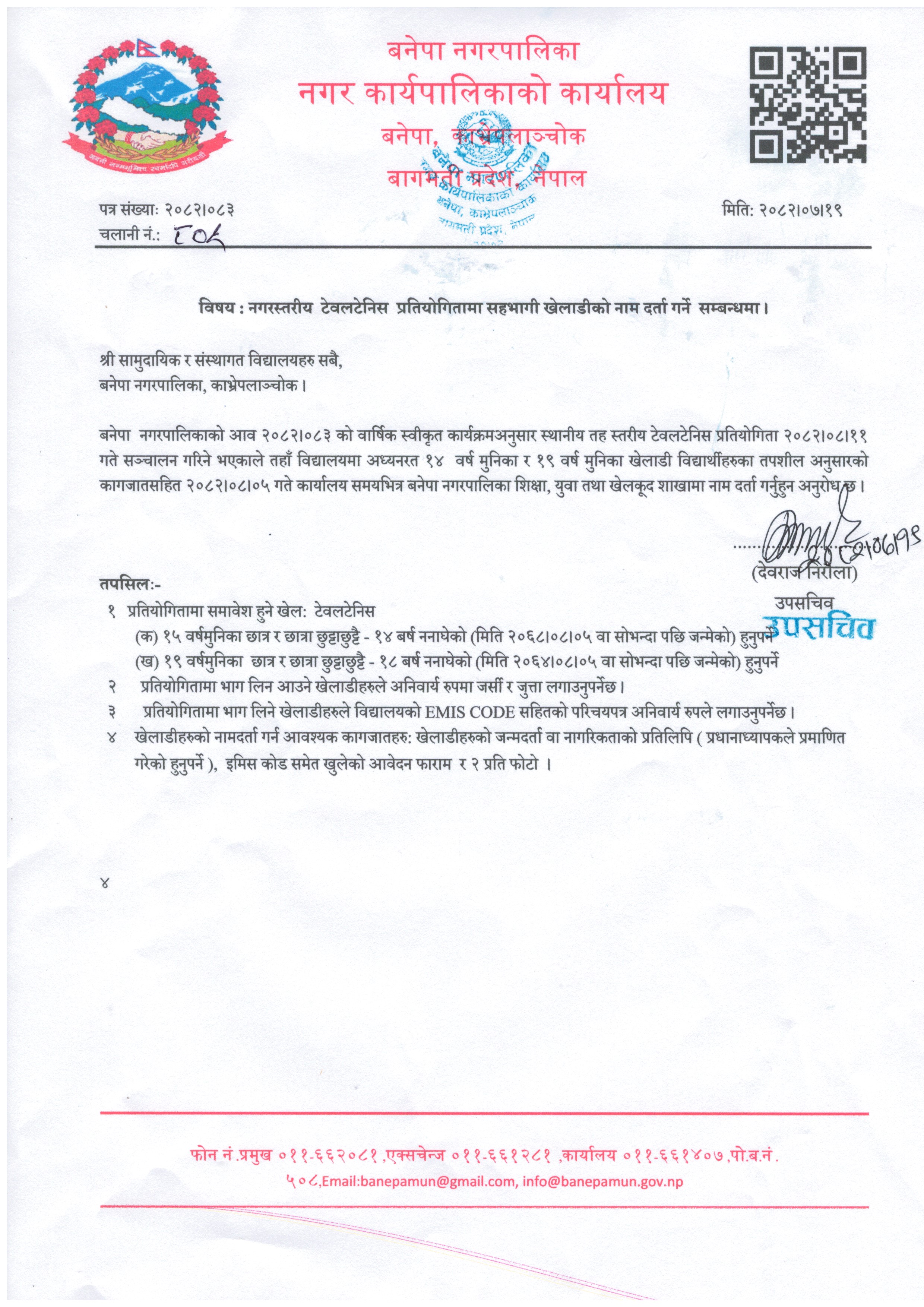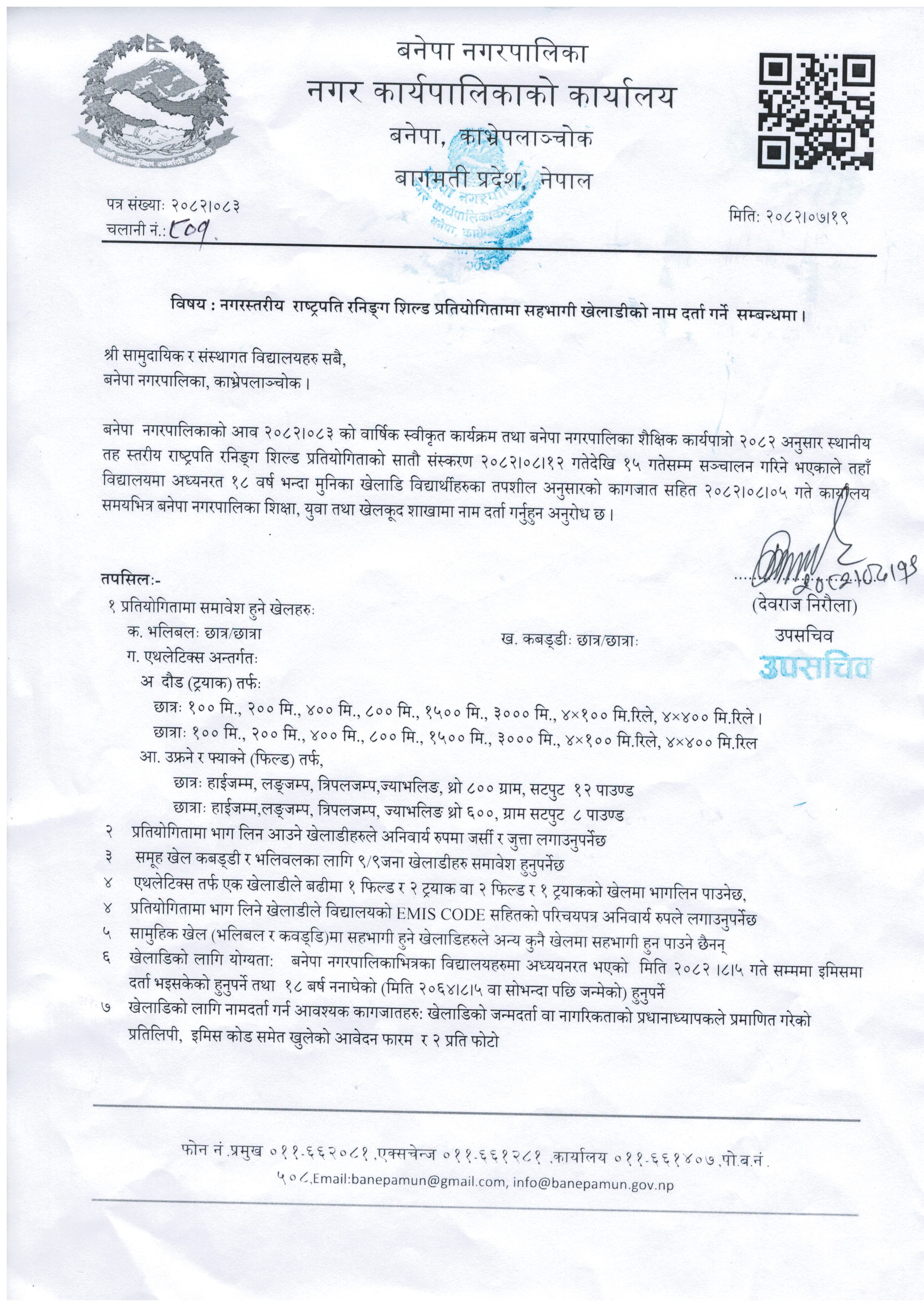 खेलकुद प्रतियोगिता सम्बन्धी सूचना ! (२०८२।०७।१९)