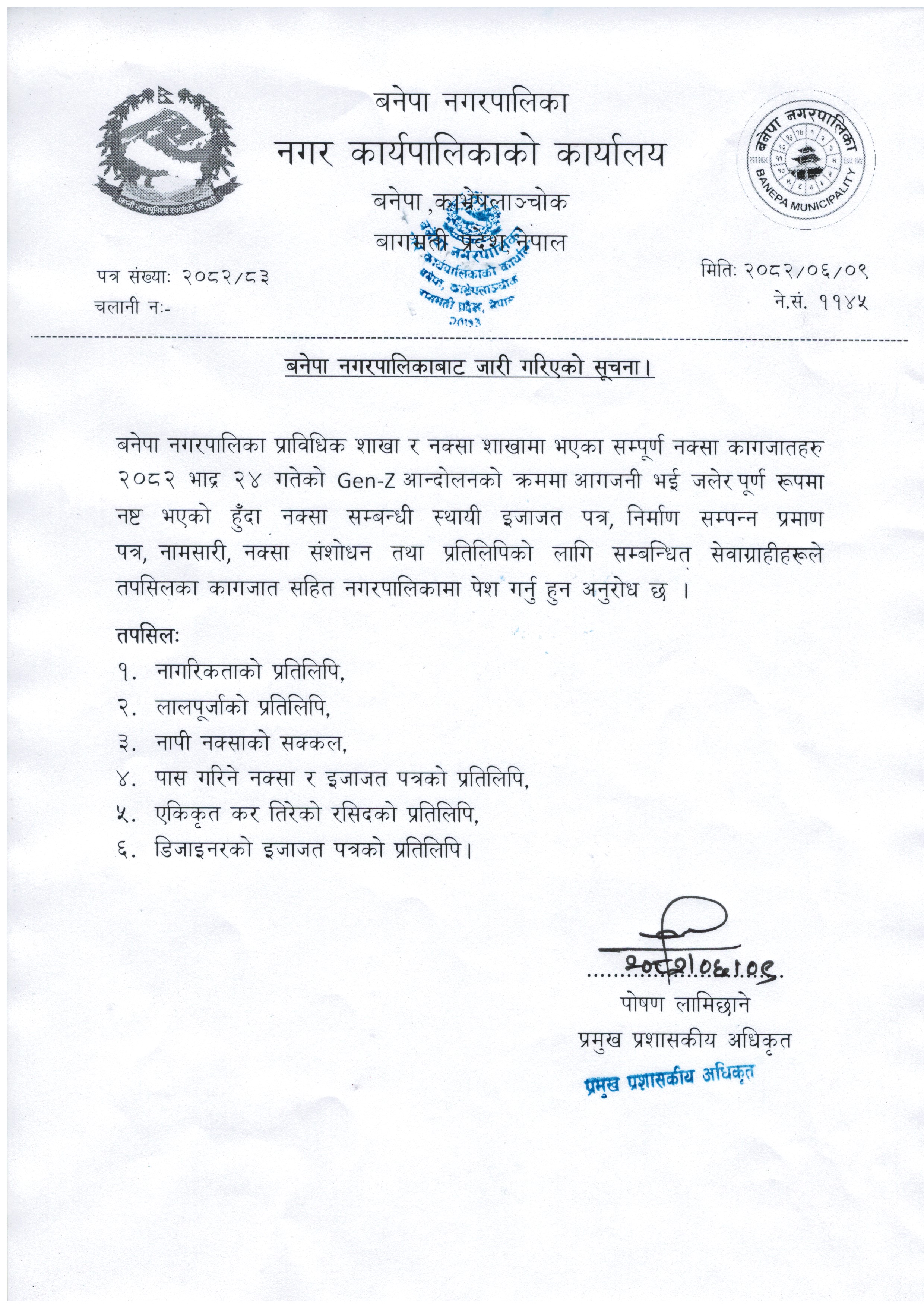 बनेपा नगरपालिकाबाट जारी गरिएको सूचना ! (२०८२।०६।०९)