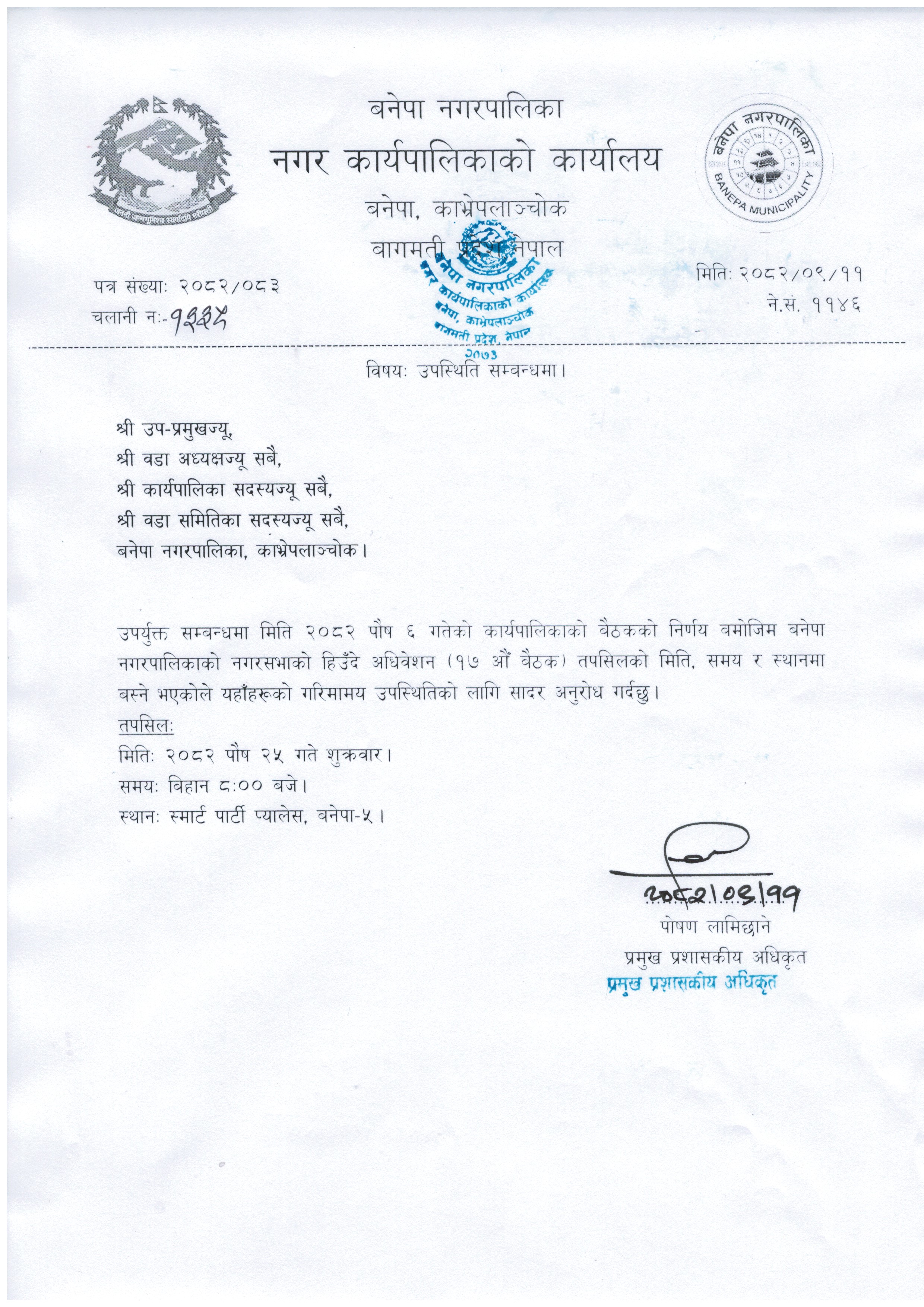 नगरसभाको हिउँदे अधिवेशनमा उपस्थित हुने सम्बन्धमा । (२०८२।०९।११)