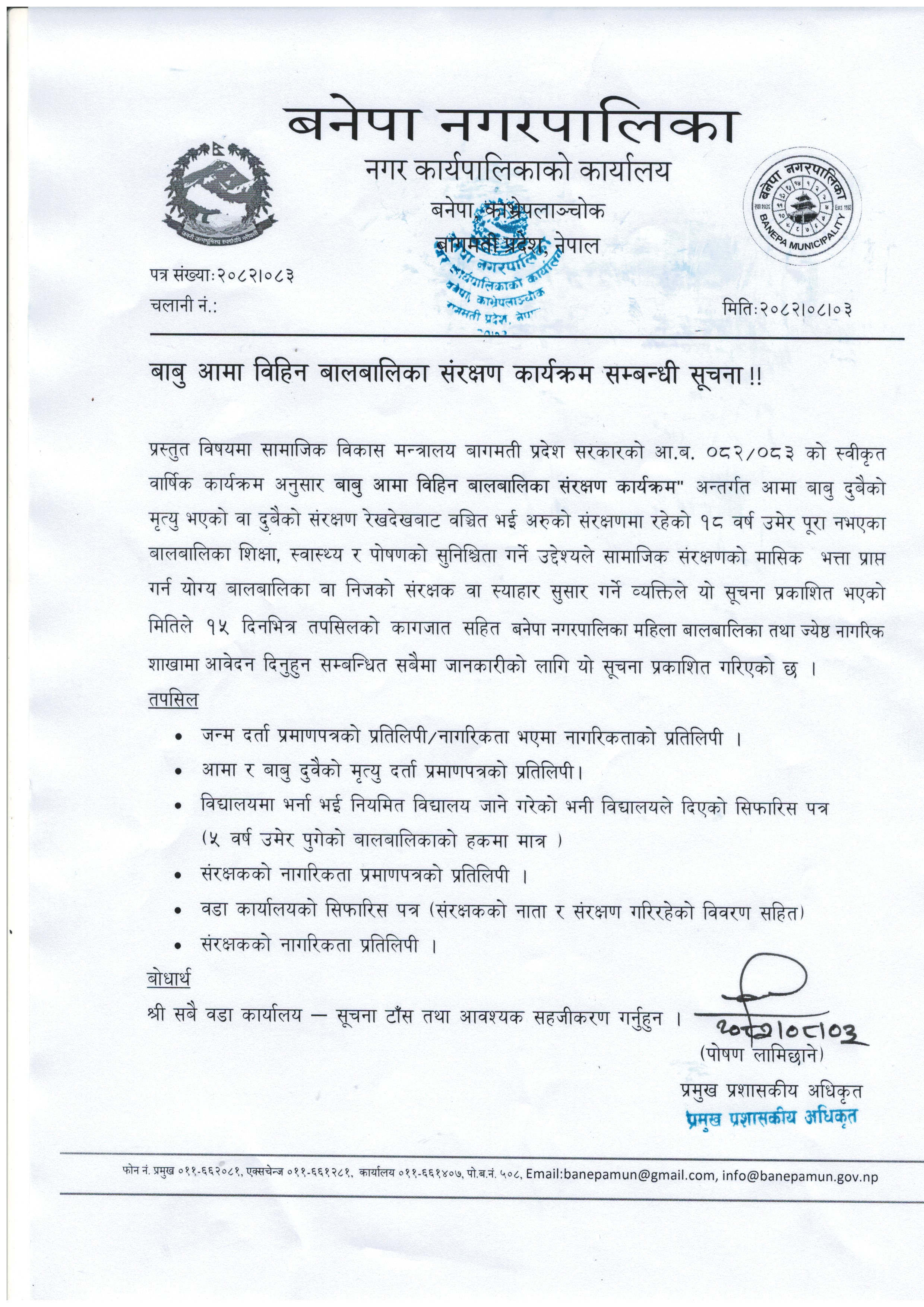 बाबुआमा विहिन बालबालिका संरक्षण कार्यक्रम सम्बन्धी सूचना ! (२०८२।०८।०३)