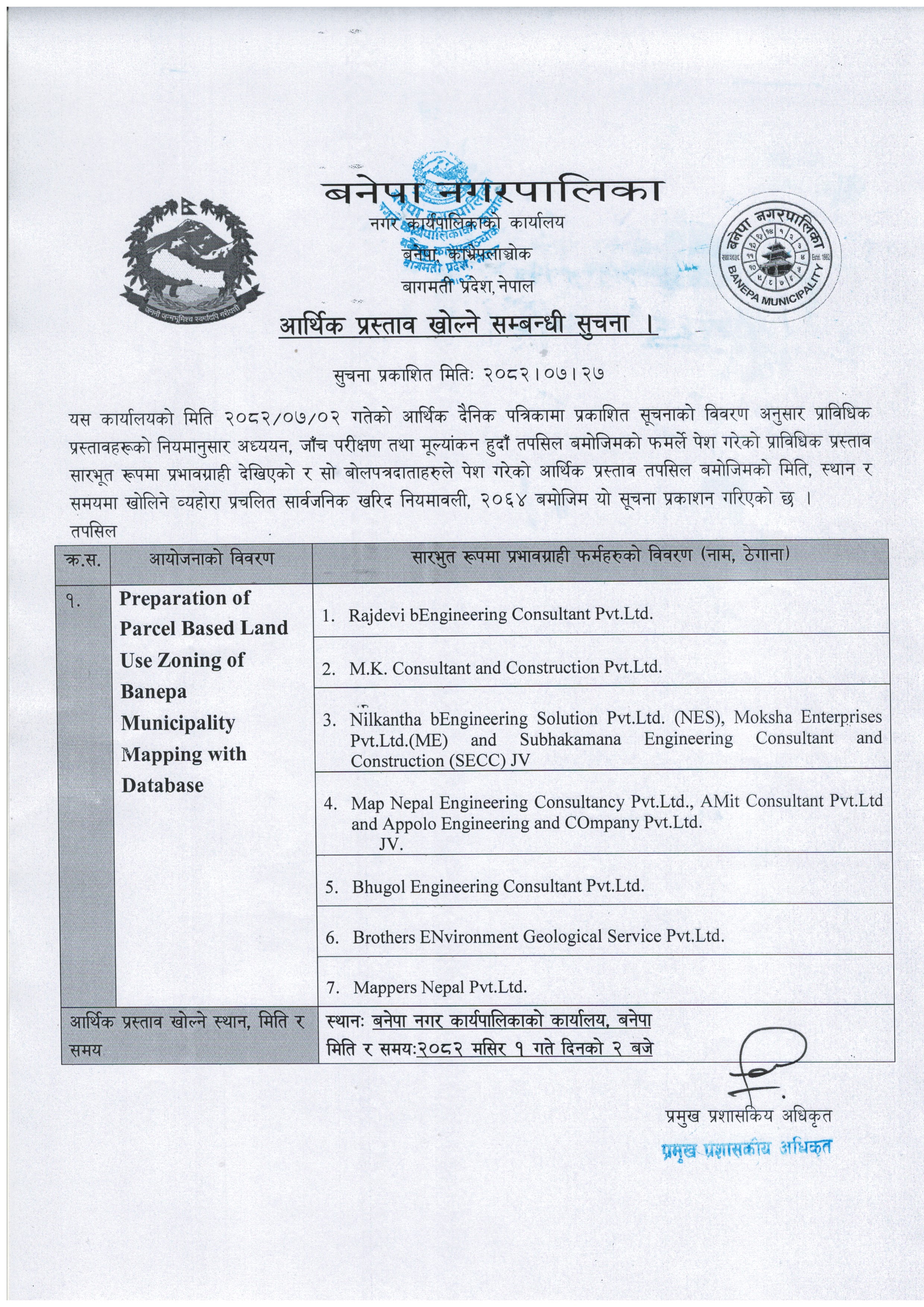 आर्थिक प्रस्ताव खोल्ने सम्बन्धी सूचना । ( २०८२।०७।२७)