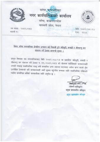 बनेपा नगरपालिका क्षेत्रभित्र उत्पादन भई निकासी हुने जडिबुटी कवाडी र जीवजन्तु कर संकलन सम्बन्धी सूचना ! (२०८२।०८।१३)