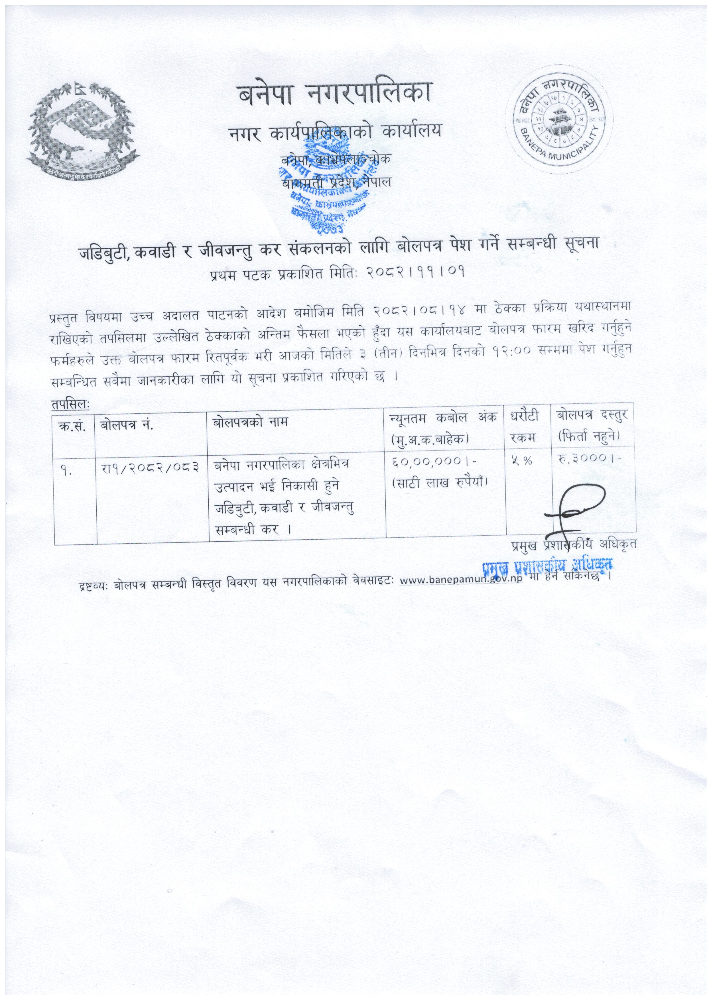 » जडिबुटी, कवाडी र जीवजन्तु कर संकलनको लागि बोलपत्र पेश गर्ने सम्बन्धी सूचना ! (२०८२।११।०१)