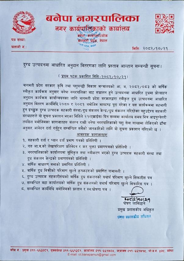 दुग्ध उत्पादनमा आधारित अनुदान वितरणका लागि प्रस्ताव आव्हान सम्बन्धी सूचना ! (२०८२।१०।२१)