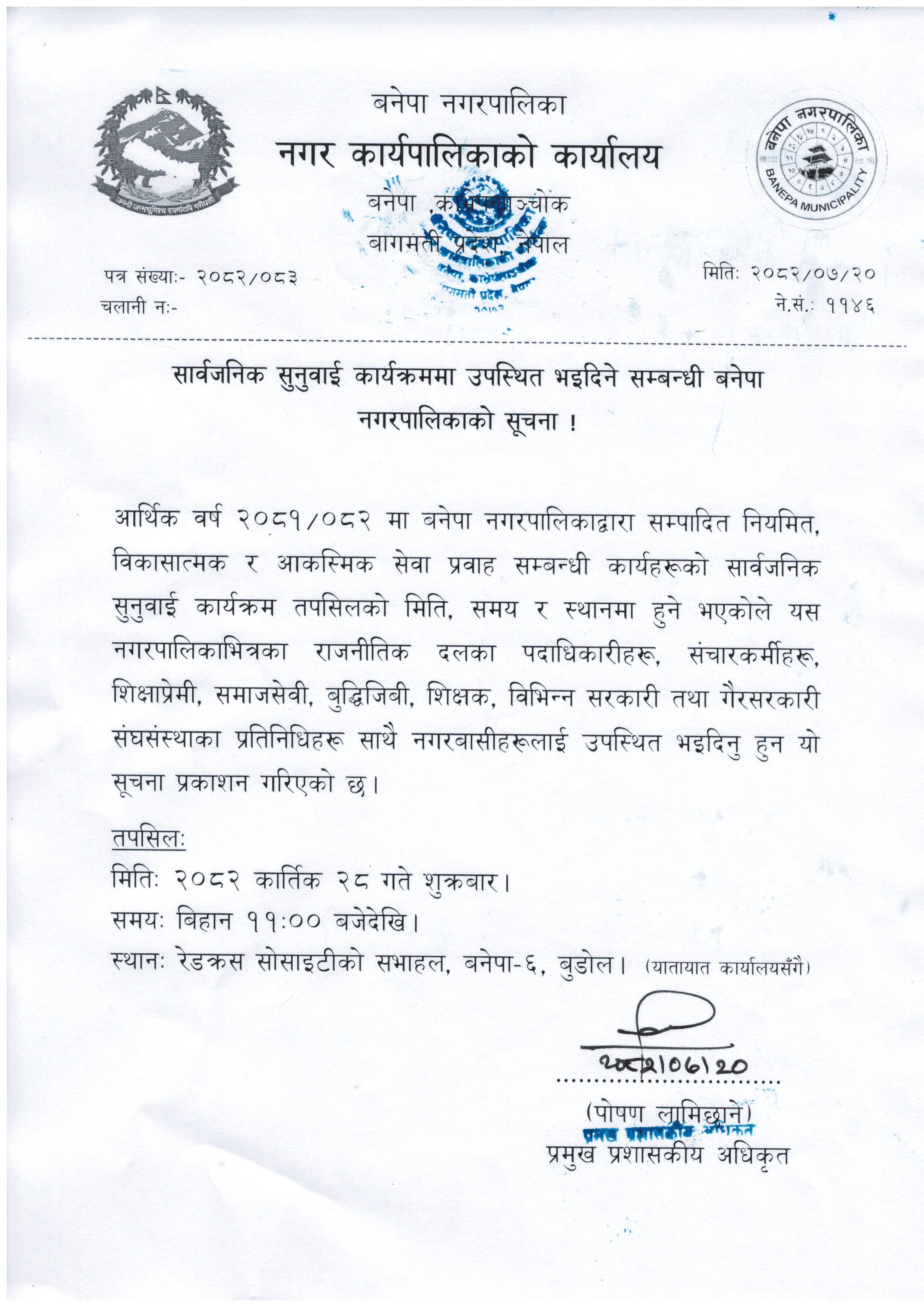 सार्वजनिक सुनुवाई कार्यक्रममा उपस्थित भइदिने सम्बन्धी सूचना ! (२०८२।०७।२०)