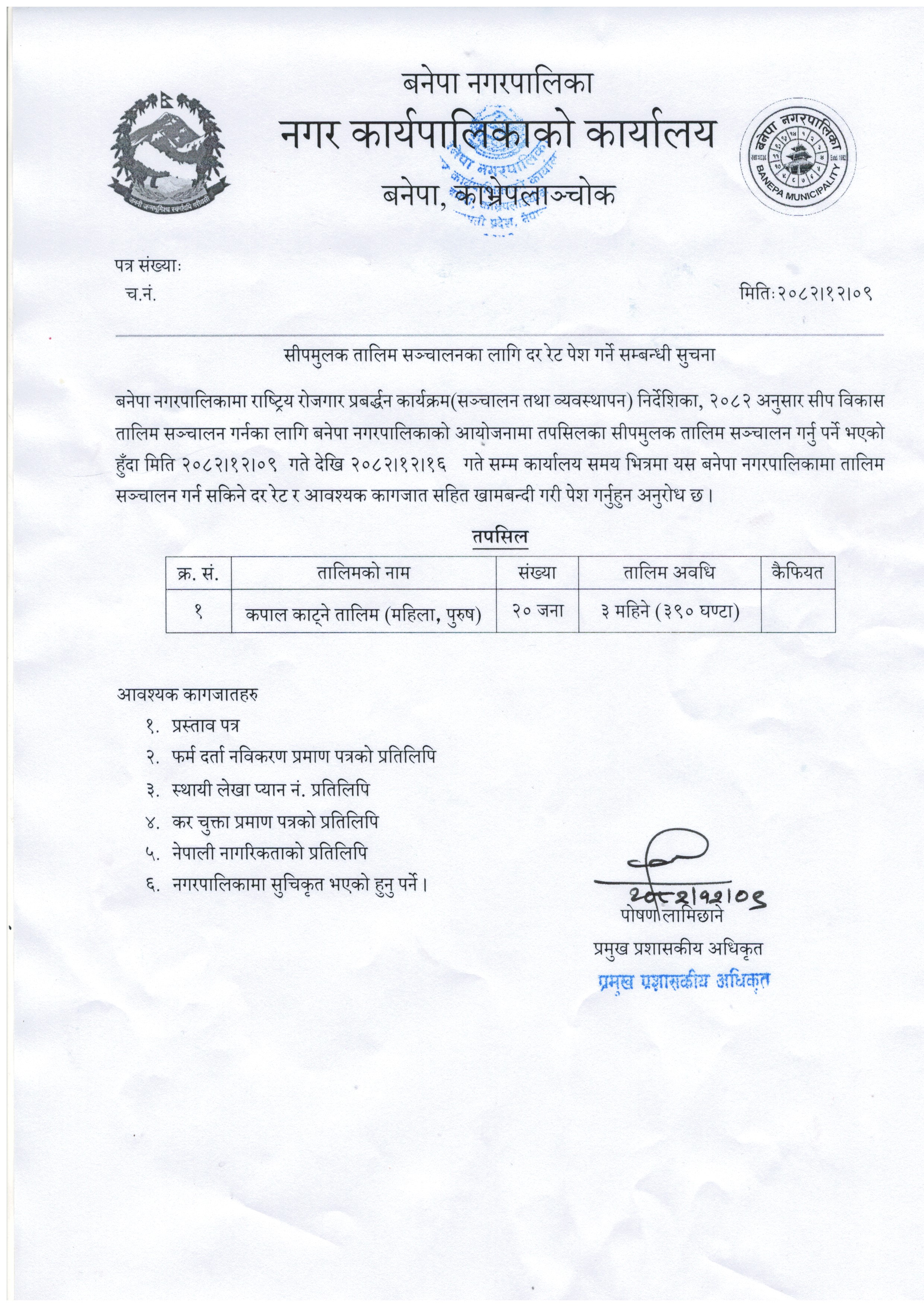 सीपमुलक तालिमका लागि दररेट पेश गर्ने सम्बन्धी सूचना (२०८२।१२।०९)